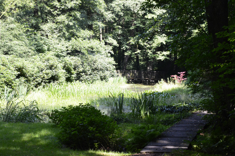 Odwiedzający ten zakątek mogą obserwować malowniczą scenerię stawu i szuwarów z wygodnej ścieżki-kładki, a przy okazji odpocząć na ławce pod okapem starych drzew. Kwitnące tu rośliny dostarczają bogactwa barw, na tle wody szczególnie efektownie wyglądają biało kwitnące: żabiściek pływający i strzałka wodna. W nadwodnym drzewostanie rośnie dławisz okrągłolistny – pnącze podobne do naszego krajowego bluszczu, lecz pochodzące z południowo-wschodniej Azji. Staw urządzony na Potoku Żabim odwiedzany jest przez płazy głównie wiosną, jednak uważny obserwator zauważy je – podobnie jak inne niewielkie zwierzęta – także w pełni lata.